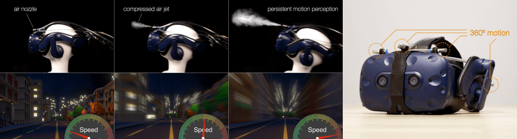 We present HeadBlaster, a novel wearable technology that creates motion perception by applying ungrounded force to the head to stimulate the vestibular and proprioception sensory systems. Compared to motion platforms that tilt the body, HeadBlaster more closely approximates how lateral inertial and centrifugal forces are felt during real motion to provide more persistent motion perception. In addition, because HeadBlaster only actuates the head rather than the entire body, it eliminates the mechanical motion platforms that users must be constrained to, which improves user mobility and enables room-scale VR experiences. We designed a wearable HeadBlaster system with 6 air nozzles integrated into a VR headset, using compressed air jets to provide persistent, lateral propulsion forces. By controlling multiple air jets, it is able to create the perception of lateral acceleration in 360 degrees. We conducted a series of perception and human-factor studies to quantify the head movement, the persistence of perceived acceleration, and the minimal level of detectable forces. We then explored the user experience of HeadBlaster through two VR applications: a custom surfing game, and a commercial driving simulator together with a commercial motion platform. Study results showed that HeadBlaster provided significantly longer perceived duration of acceleration than motion platforms. It also significantly improved realism and immersion, and was preferred by users compared to using VR alone. In addition, it can be used in conjunction with motion platforms to further augment the user experience.