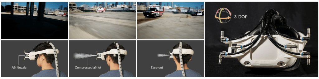 (a) TurnAhead explores the design space of applying 3-DoF rotational haptic cues to the head to improve comfort, immersion, and enjoyment of first-person viewing (FPV) experiences. In this example, a user is viewing a car chase scene from the movie Ambulance (2022) shot by FPV drones as the camera rotates to the right; (b) Our device consists of 6 air nozzles that are mounted on the front of VR headset and placed tangent to the head, and is the first wearable device capable of generating rotational forces to turn left/right (yaw axis) that is in 84% of the rotations in FPV footage.